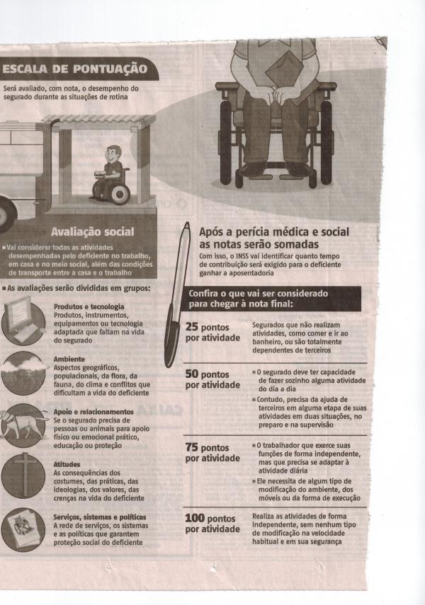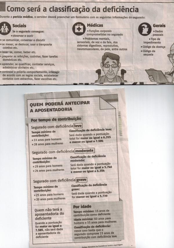 Os deficientes terão de passar por dois tipos de pericia para conseguirem a nova aposentadoria, que exige menos tempo de contribuição. Na agência da Previdência Social serão aplicadas avaliações médicas e sociais. As regras saíram ontem no “Diário Oficial da União” na segunda-feira inicia o atendimento administrativo para quem fez o agendamento.